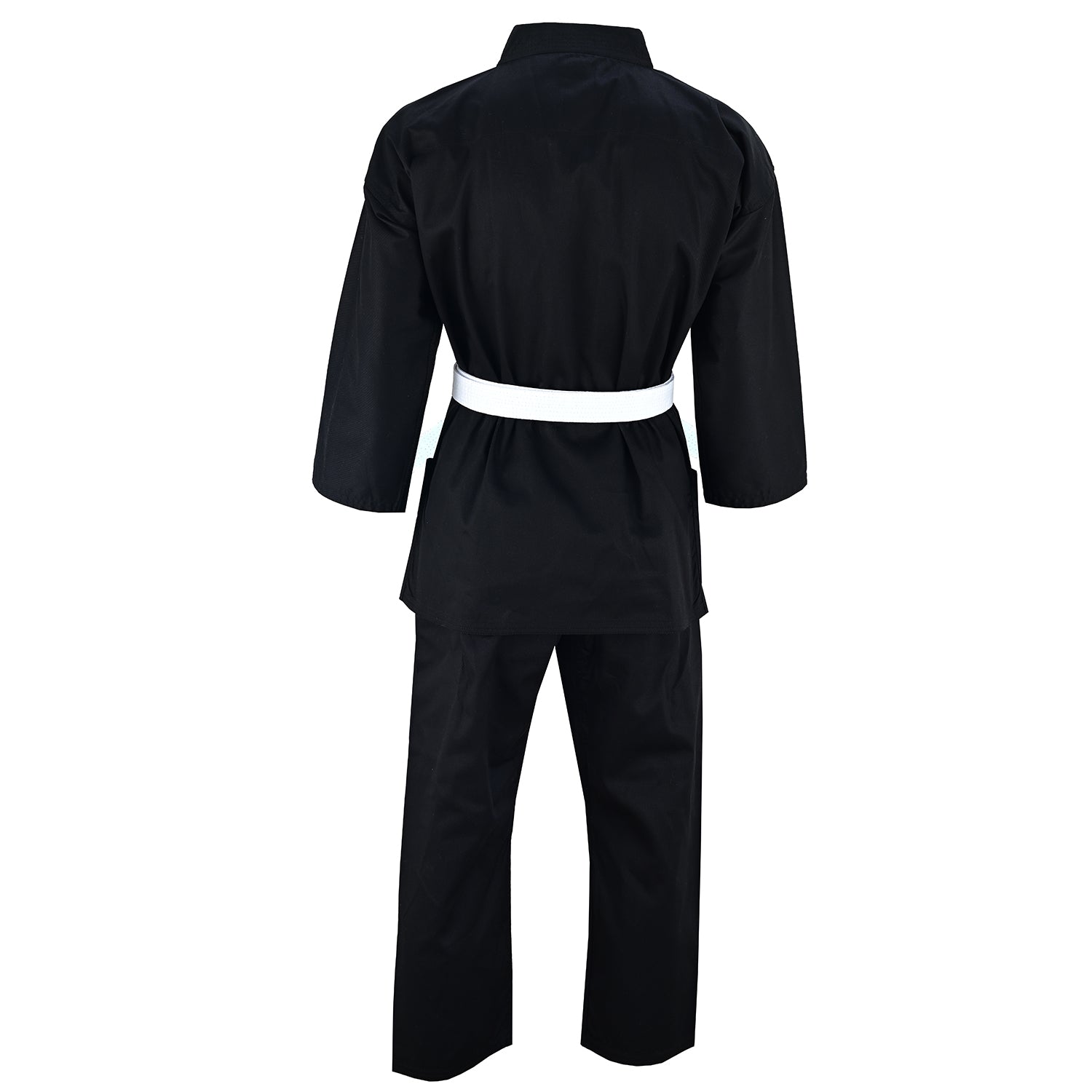 Student Karate Suit. 7oz Black. POLYCOTTON. Complete with Belt. Trousers with Elastic and Cord Waist for all sizes. Excellent Karate Uniform made with finest Bleached Cotton. Karate Black Suits are Medium Weight 8oz 100% Cotton and of top quality and designed for comfort fit to give you a greater range of movement. There is no other match to Playwell Uniforms.