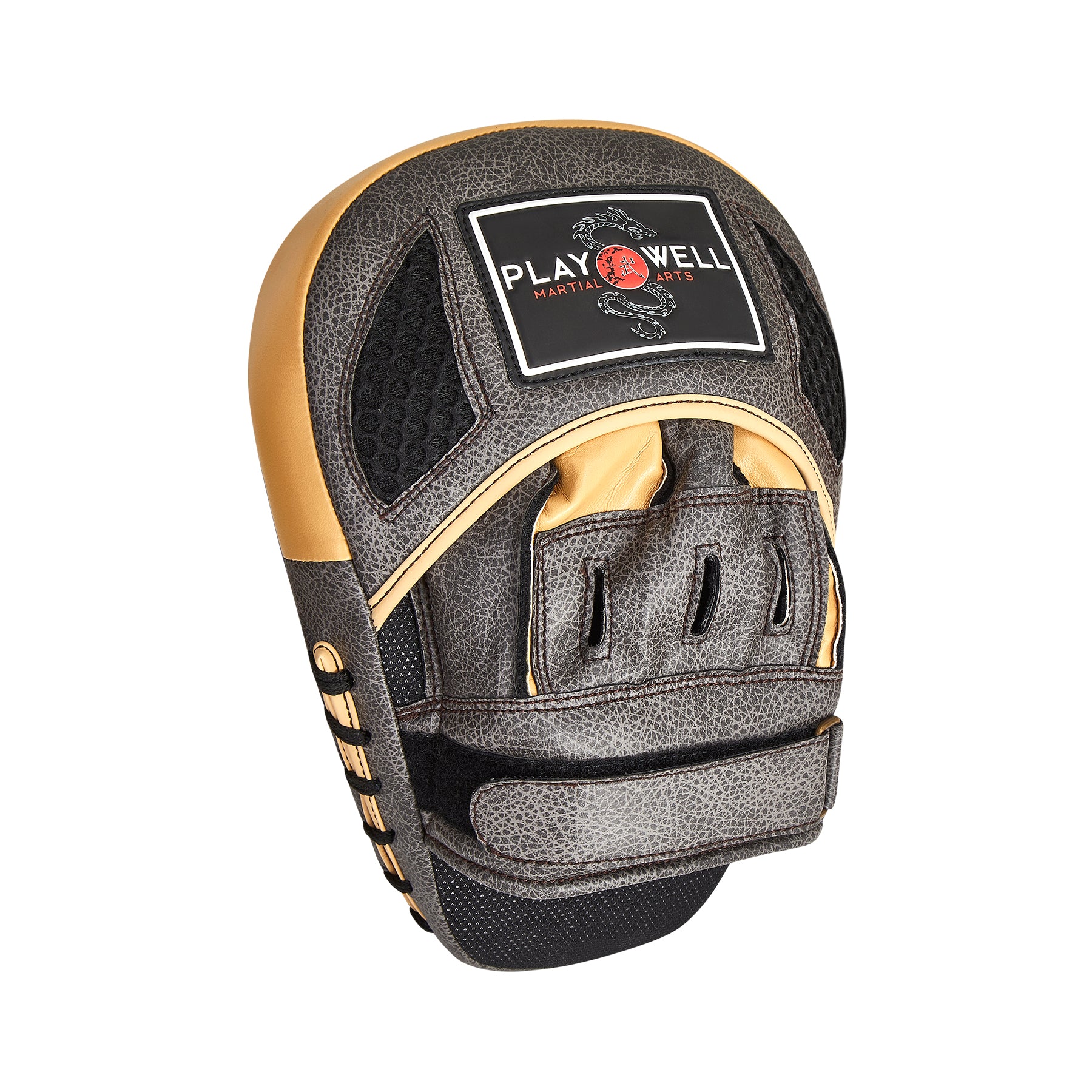Playwell' New vintage Series Curved Target Focus Pads, is Made from Premium Imported Skintex Leather Material, Ultra-lightweight, focus mitts allow an in-depth and improved work on the striking technique and strike velocity. Their pro-concave design offers a perfect striking surface on one side, and a superior comfort - with a minimizing risk of injury - for the trainer on the other side.