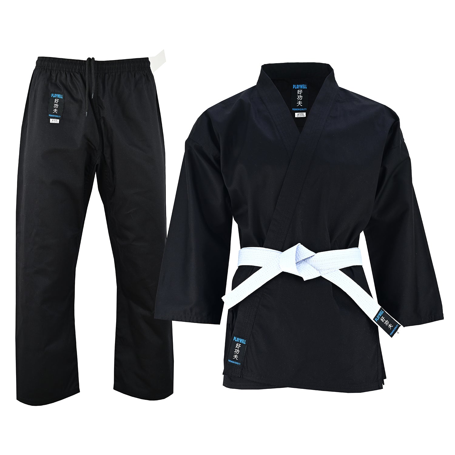 Excellent Karate Uniform made with finest Bleached Cotton. Our Karate Black Gis are Medium Weight 8.5oz and of top quality and designed for comfort fit to give you a greater range of movement. There is no other match to Playwell suits.